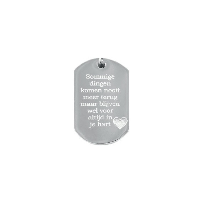 Deze hanger in staal is geschikt voor een fotogravure, een vingerprint of een tekst. Op de voorkant van de hanger wordt de foto of de vingerprint gegraveerd of een tekst, op de achterkant is er plaats voor een nieuwe tekst gravure, een naam, datum of een andere leuke kleine boodschap.