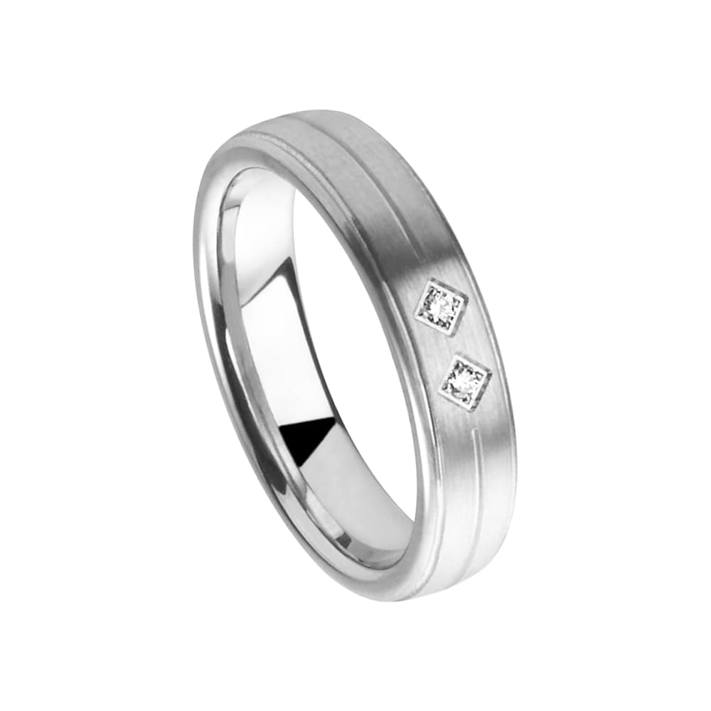 Deze trouwring of vriendschapsring 5538-MA/50 uit de Amici collectie is een stainless steel langsmat gematteerde trouwring. Deze ring is gezet met 2 briljanten (VS/Si -- G/H) met elk een gewicht van 0.014ct in een zetting met 4 grainen. De ring heeft een boord van 5mm diameter.