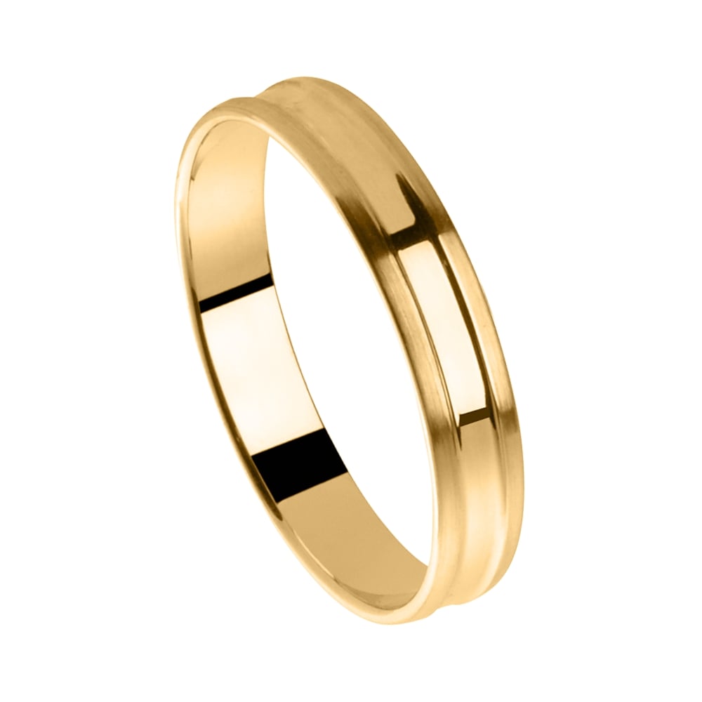 Deze trouwring of vriendschapsring 5717-G/40 uit de Amici collectie is een geelgouden 18 karaat trouwring in hoogglans afwerking en langsmat gematteerd. De ring heeft een boord van 4 mm diameter.
