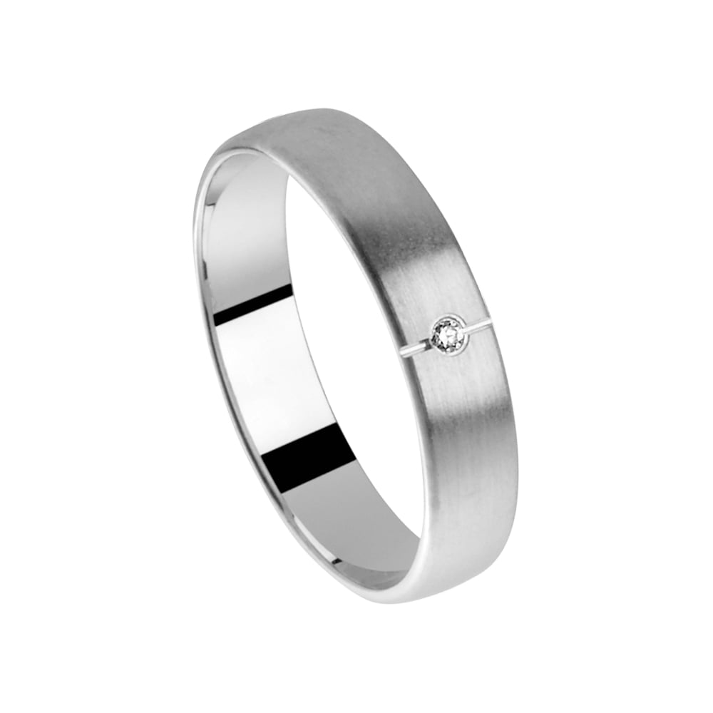 Deze trouwring of vriendschapsring 5714-W/50 uit de Amici collectie is een witgouden 18 karaat trouwring in langsmat gematteerd. De ring is gezet met een 0.01ct briljant (VS/SI -- G/H) in potzetting. Deze ring heeft een boord van 5 mm diameter.