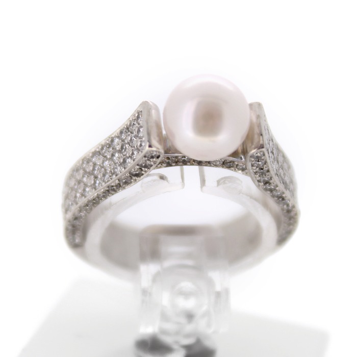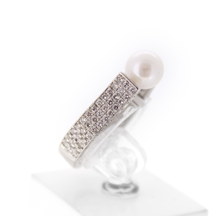 Deze tweedehands ring is vervaardigd uit wit goud 18 karaat. De 18 karaat witgouden ring is gezet met een parel en briljanten.