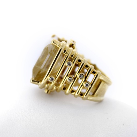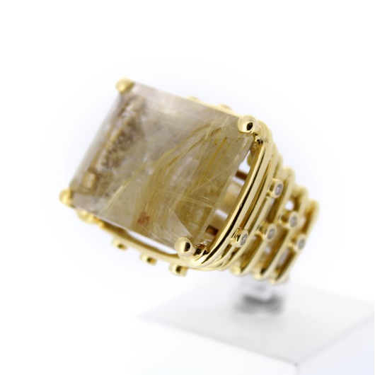 Deze tweedehands ring is vervaardigd uit geelgoud 18 karaat. De ring is gezet met een Ruthyl quartz en briljanten.