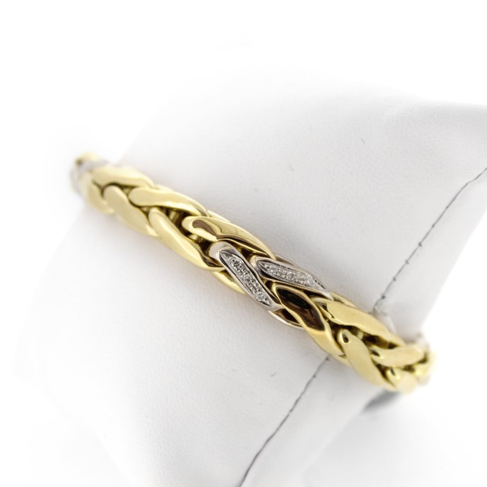 Dit tweedehands juweel is een armband vervaardigd uit bicolor wit en geelgoud 18karaat. De armband is gezet met briljantjes.