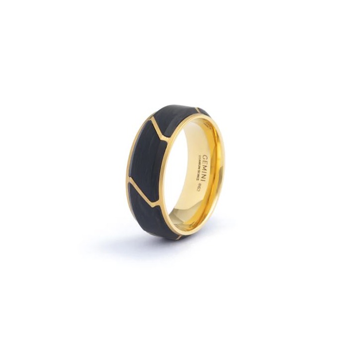 De Carus Gold ring CAR03 is volledig gemaakt van titanium en gesmeed koolstof. Deze ring is het toppunt van onze ringcollectie vanwege het vakmanschap dat nodig is om deze ring op deze manier af te werken. De diagonale lijnen van het titanium kruisen de koolstofvezelstructuren en alles komt samen tot één prachtig geheel.