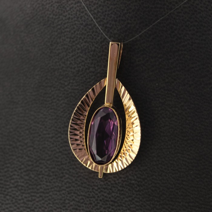 Deze tweedehands hanger is vervaardigd uit geelgoud 18 karaat. De hanger is gezet met een Amethist.