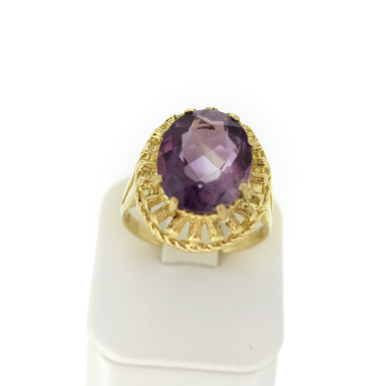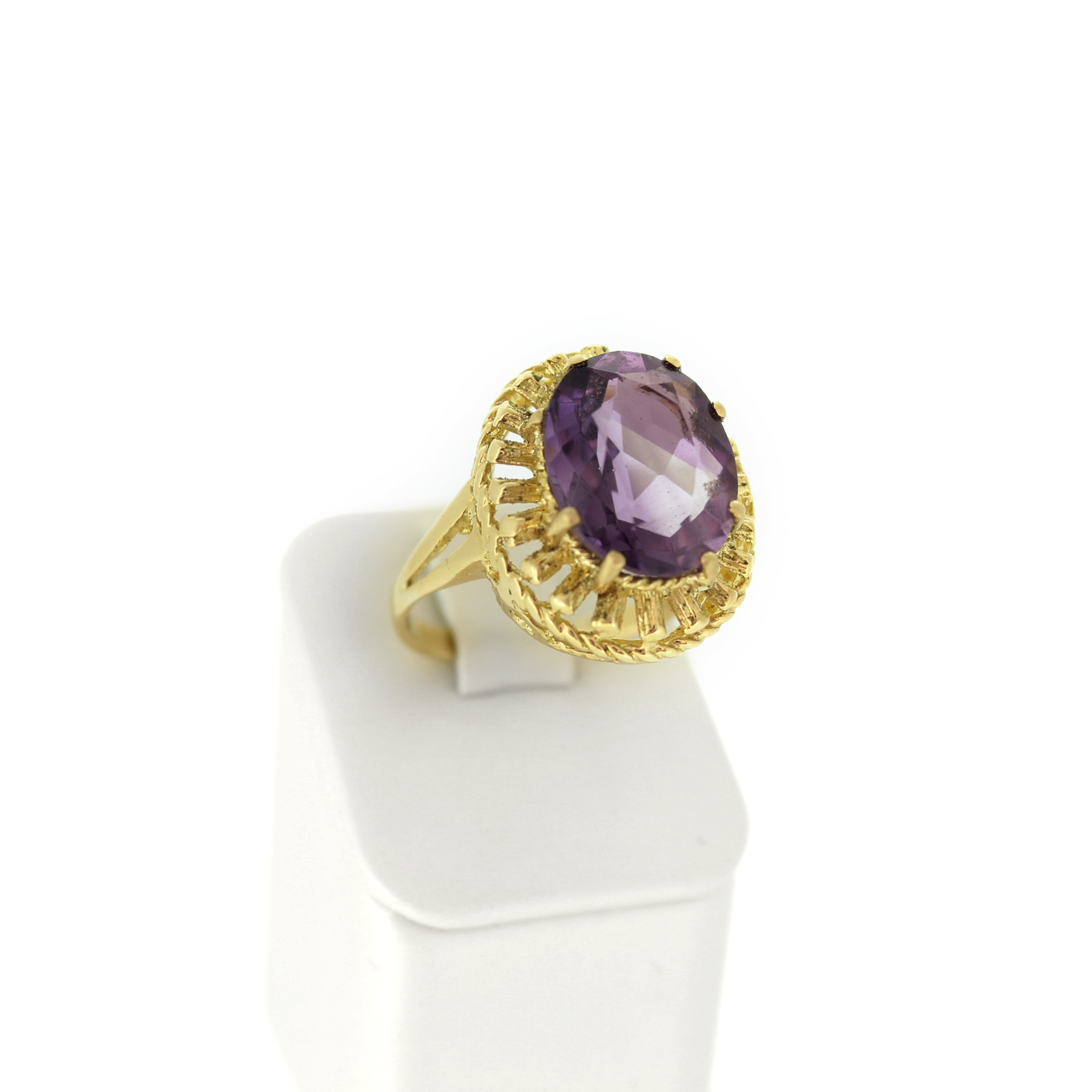 Deze tweedehands ring is vervaardigd uit geelgoud 18 karaat. De ring is gezet met een Amethist kleursteen.