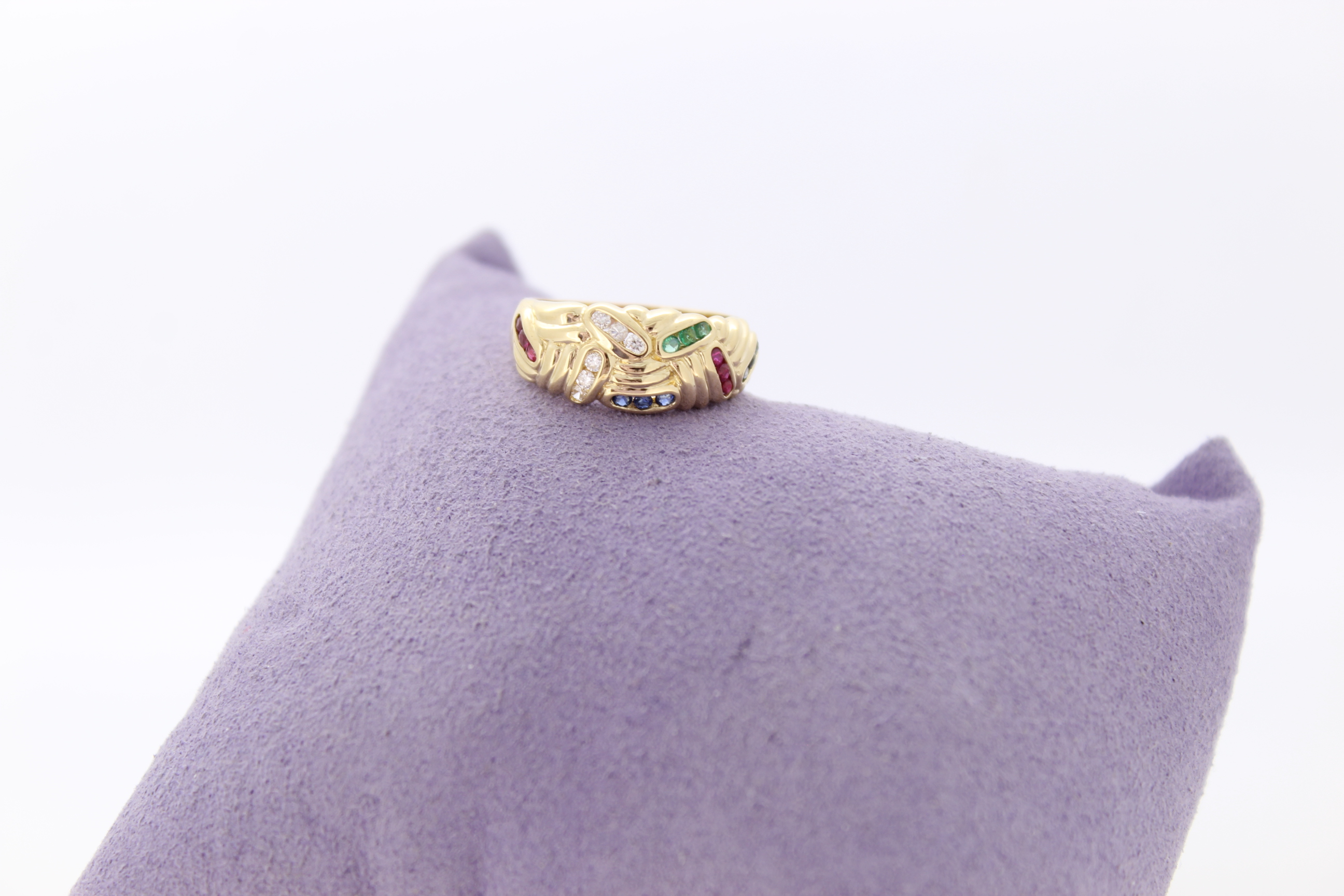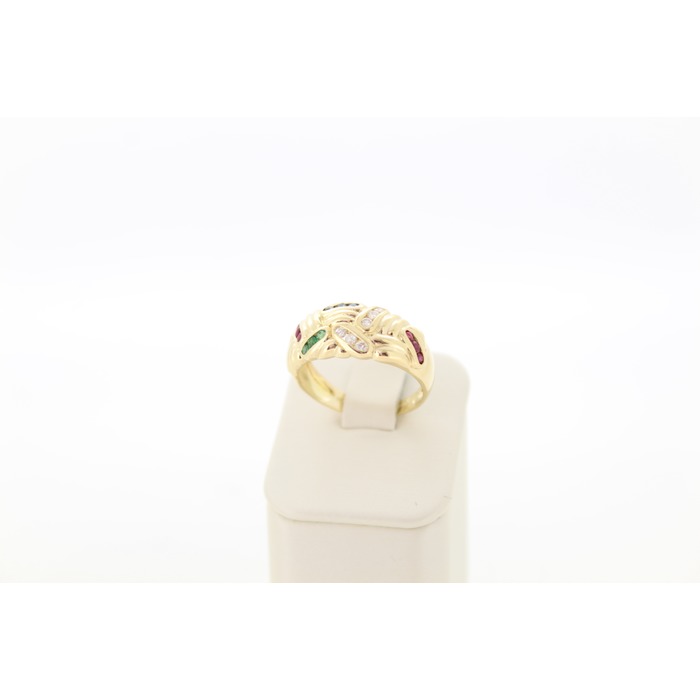 Deze tweedehands ring is vervaardigd uit geelgoud 18 karaat. De ring is gezet met kleursteentjes.