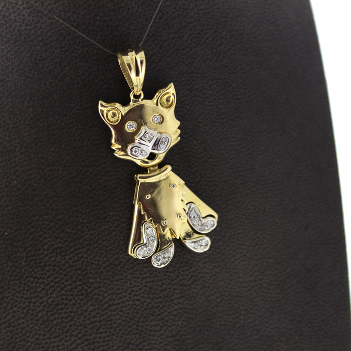 Deze tweedehands hanger in de vorm van een poes is vervaardigd uit bicolorkleurig 18 karaat. De hanger is gezet met briljanten.