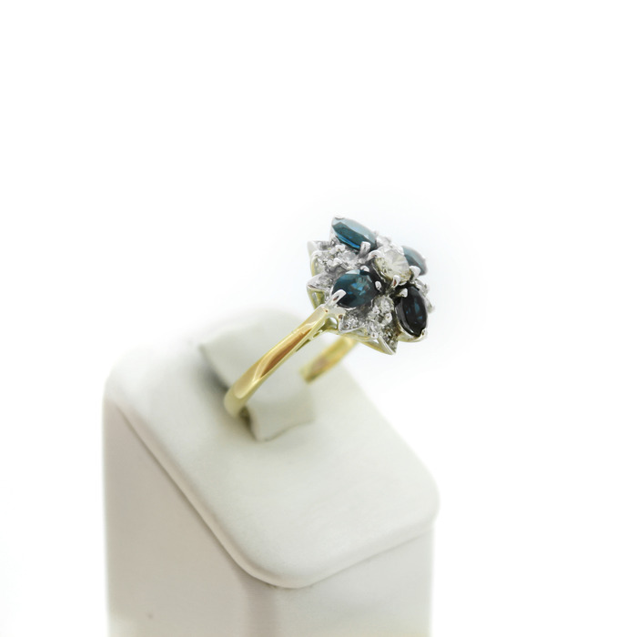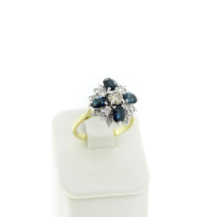Deze tweedehands ring is een cocktail ring vervaardigd uit geelgoud 18 karaat. De ring is gezet met briljanten en een Saffier.