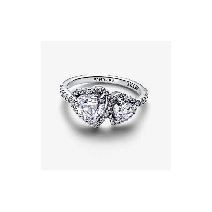 Een opvallend liefdesstatement. Deze ring 193659C01 heeft twee hartvormig geslepen heldere zirkonia, verbonden door een halo van glinsterend pavé. De bovenste helft van de band is gemaakt van sterlingzilver en versierd met meer sprankelende stenen voor een stralend effect. Combineer hem met andere sterlingzilveren ringen voor een stapel vol liefde, of draag hem solo als een stralend statement. De twee harten zijn geïnspireerd op de liefde die ons verbindt en symboliseren harmonie en niet-aflatende steun tussen twee zielen.