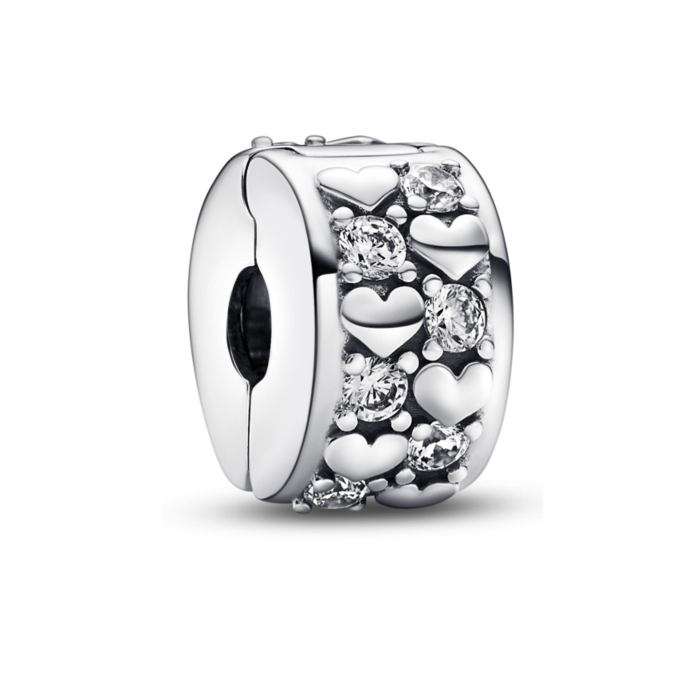 Beveilig je charmes en houd ze veilig met dit symbool van liefde. De Infinite Hearts Sparkling Clip Charm is gemaakt van sterling zilver en heeft twee rijen verhoogde harten met sprankelende stenen voor een meer verheven look. Draag hem om je armband en laat je favoriete bedels opvallen. Let op: deze clip charm heeft een siliconen grip en past niet over draden (de twee verhoogde charm dividers).