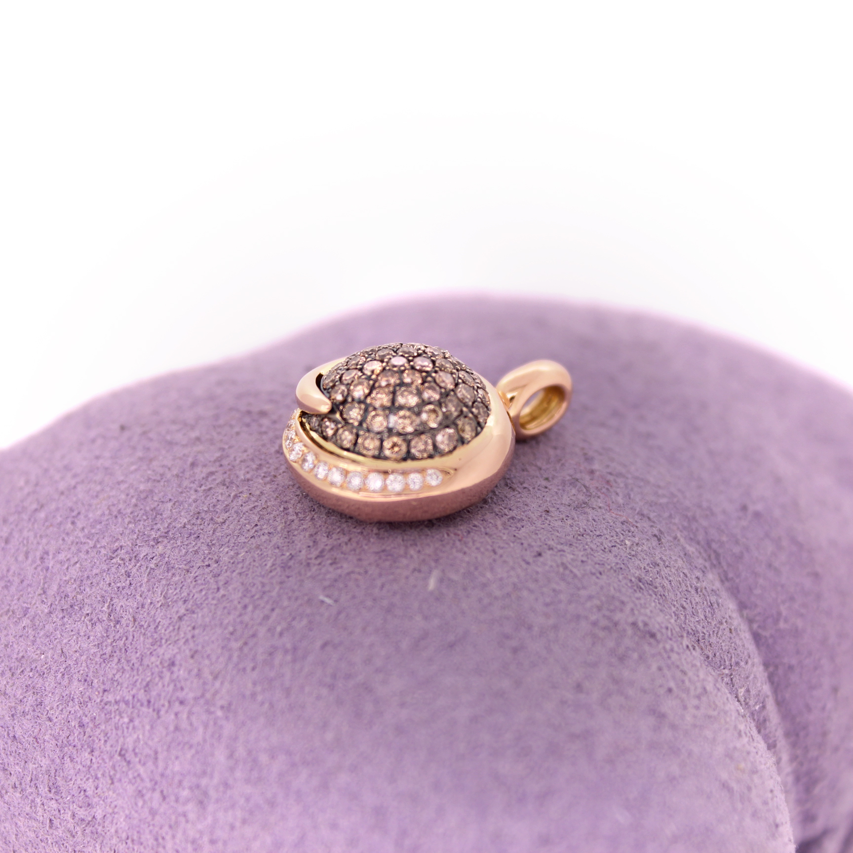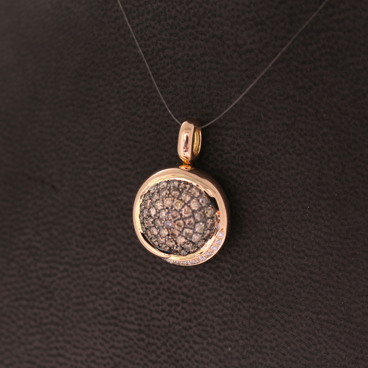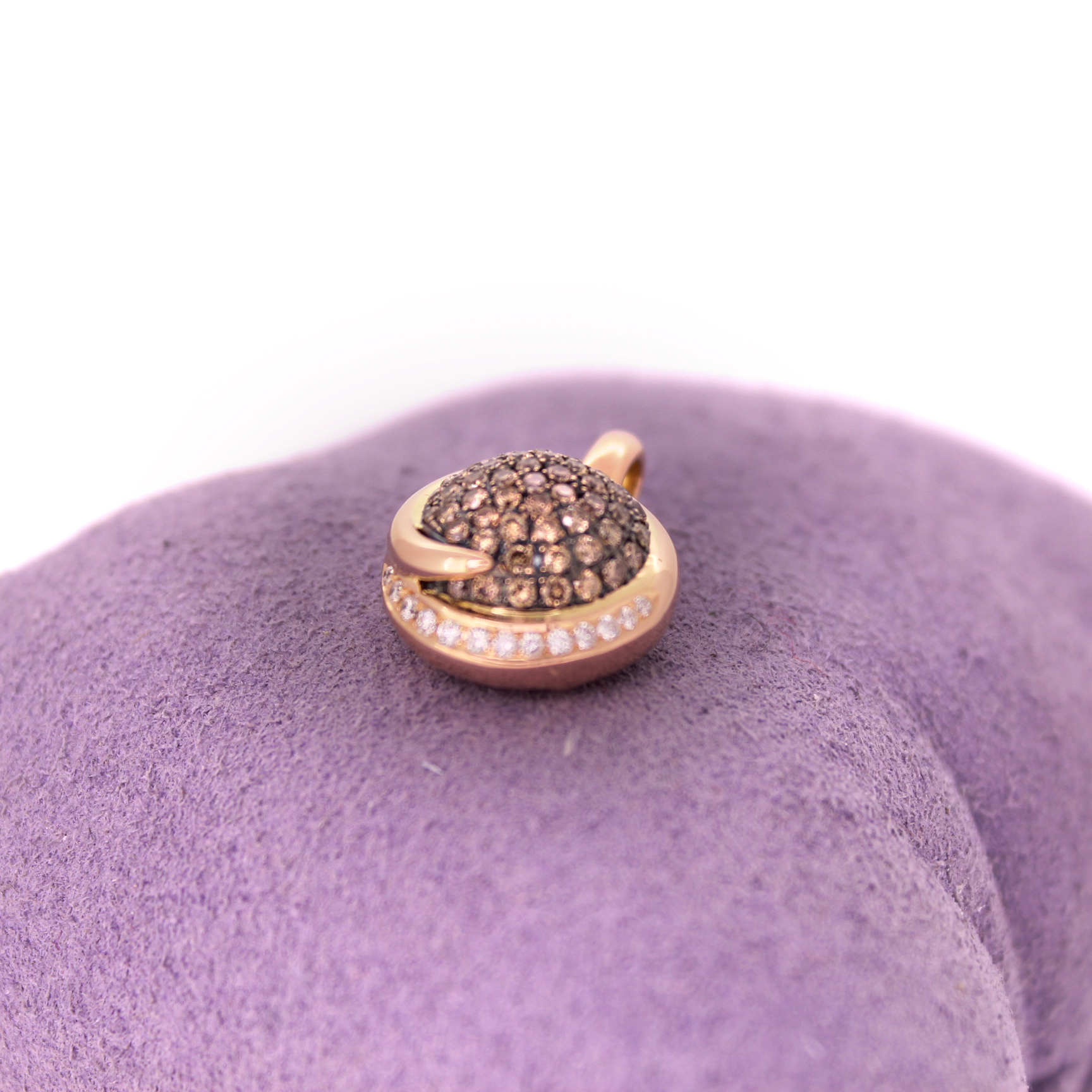 Deze exclusieve tweedehands hanger van Tirisi is vervaardigd uit 18 karaat rosé goud en prachtig bezet met een combinatie van witte en bruine briljanten. Het verfijnde design en het warme rosé goud geven dit juweel een stijlvolle en luxueuze uitstraling.