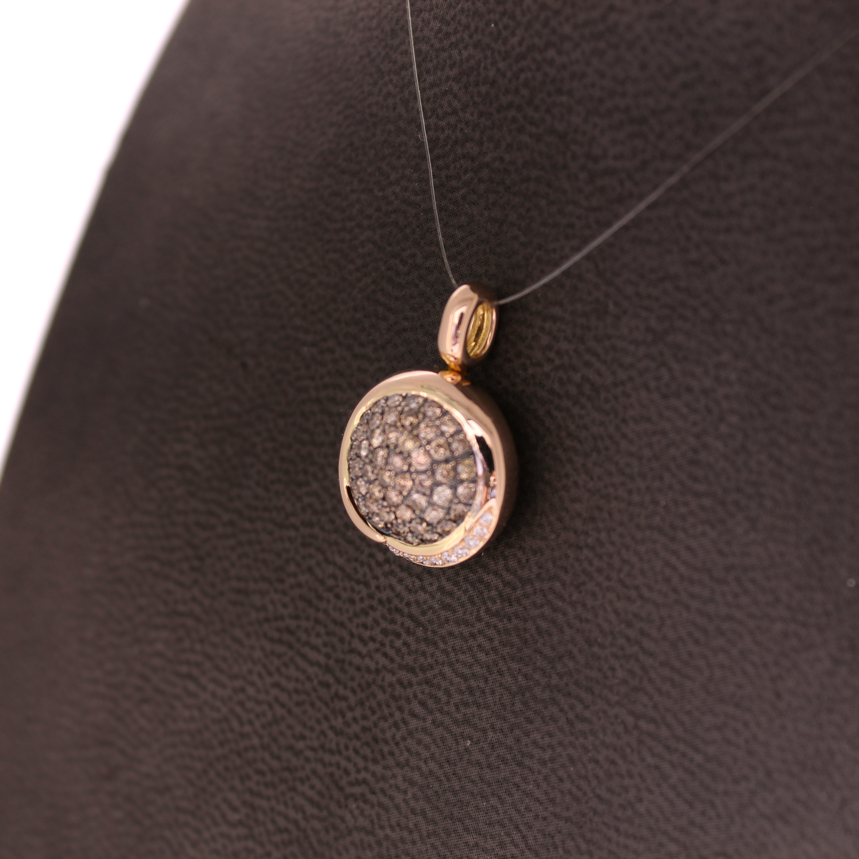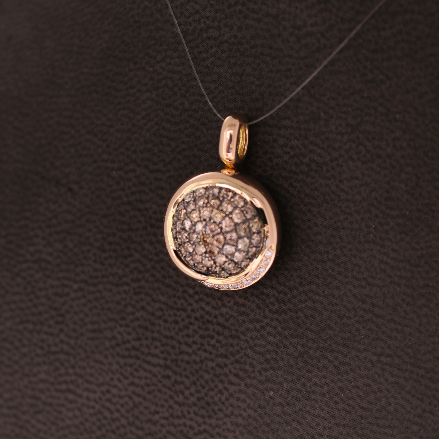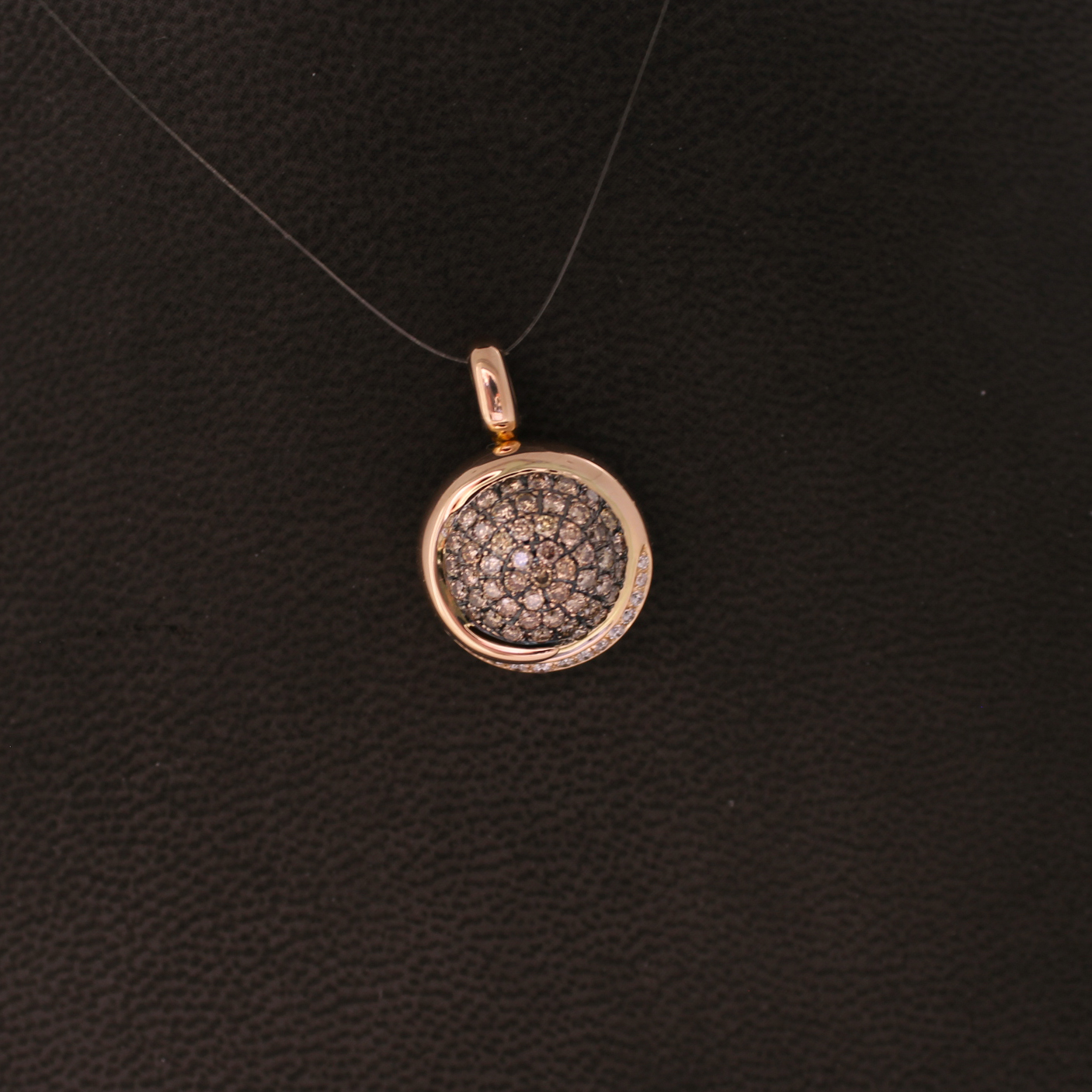 Deze exclusieve tweedehands hanger van Tirisi is vervaardigd uit 18 karaat rosé goud en prachtig bezet met een combinatie van witte en bruine briljanten. Het verfijnde design en het warme rosé goud geven dit juweel een stijlvolle en luxueuze uitstraling.