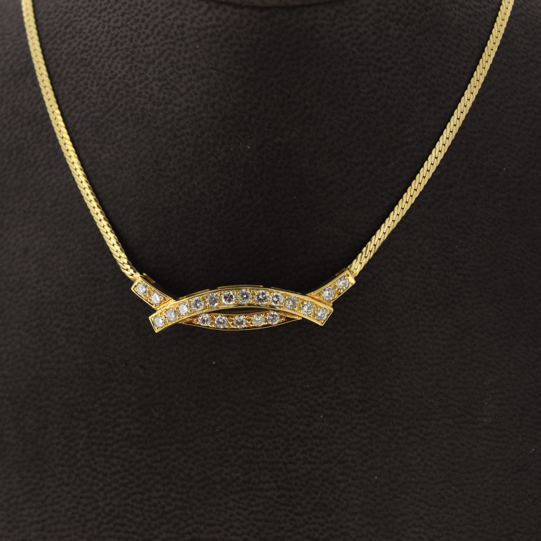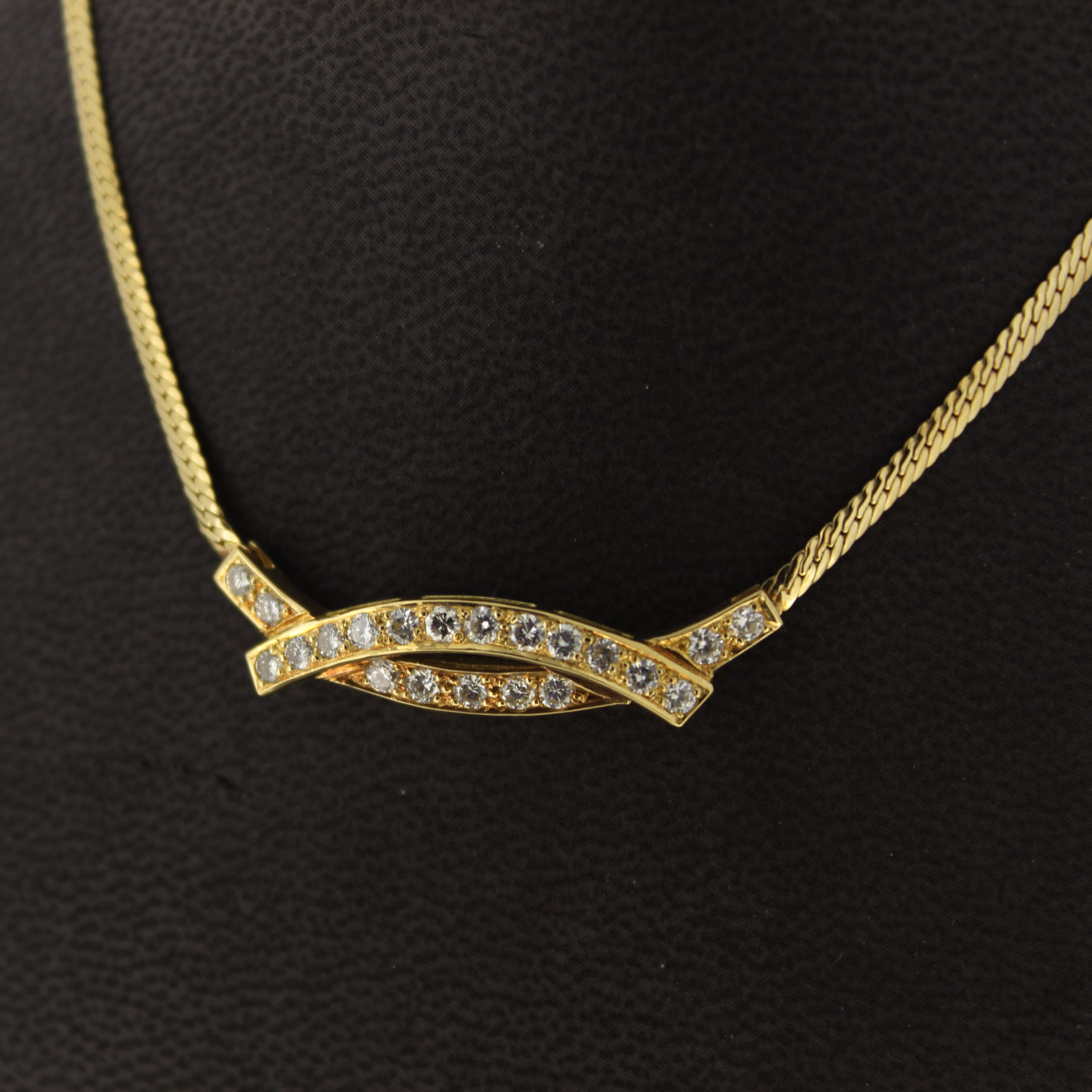 Dit elegante tweedehands collier is vervaardigd uit hoogwaardig 18 karaat geelgoud en verfijnd afgewerkt met 21 schitterende briljanten. Een tijdloos en luxueus juweel in uitstekende staat.