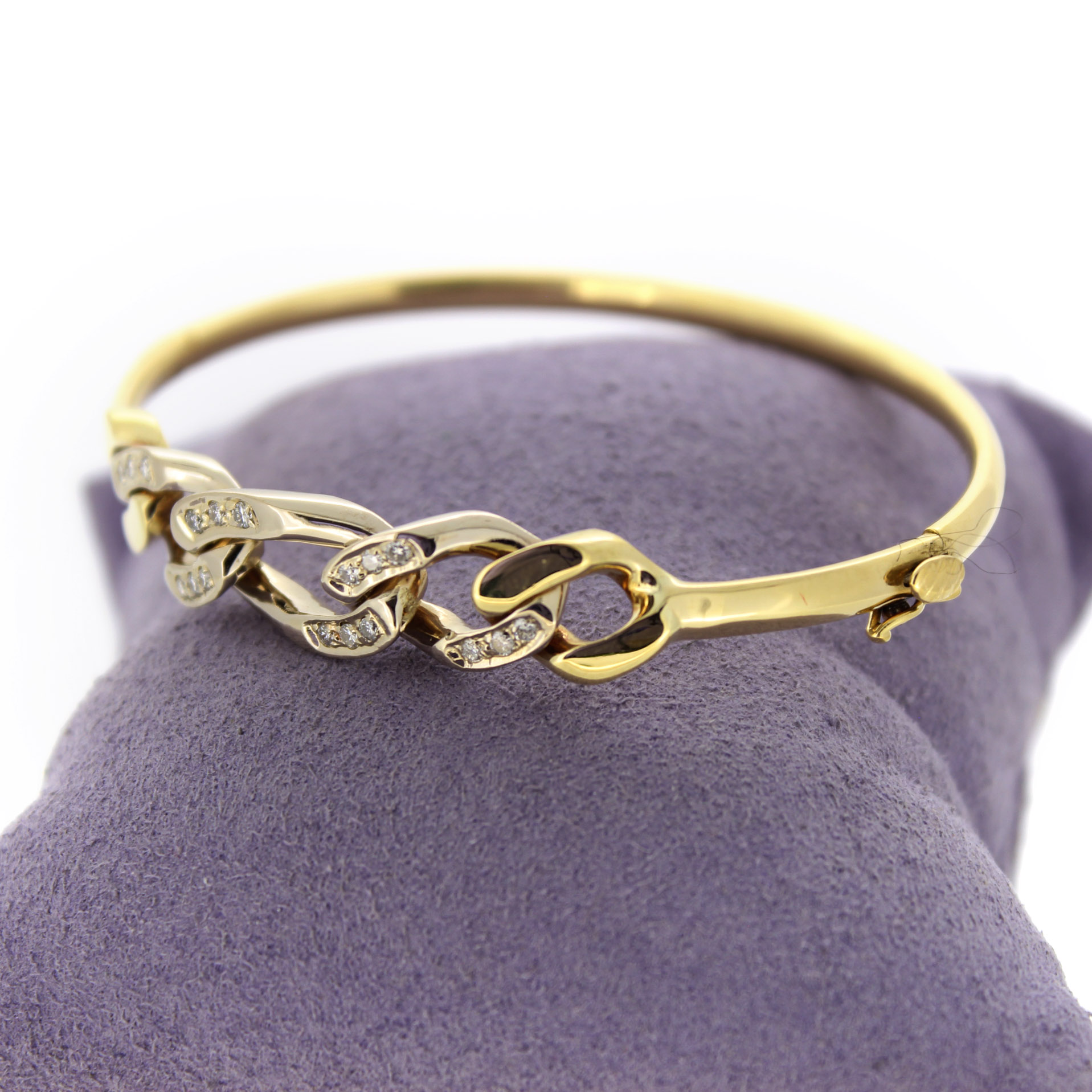 Deze stijlvolle pré-owned esclave armband is vervaardigd uit 18 karaat geelgoud en schitterend bezet met 18 briljanten. Dankzij het tijdloze ontwerp en de hoogwaardige afwerking is dit een uniek juweel dat elegantie uitstraalt.