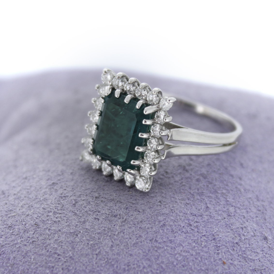 Deze stijlvolle pré-owned ring is vervaardigd uit 18 karaat witgoud en bezet met verfijnde zirconium steentjes. De centrale smaragd vormt een elegante blikvanger, en zorgt samen met het witgoud voor een tijdloos en luxueus geheel.