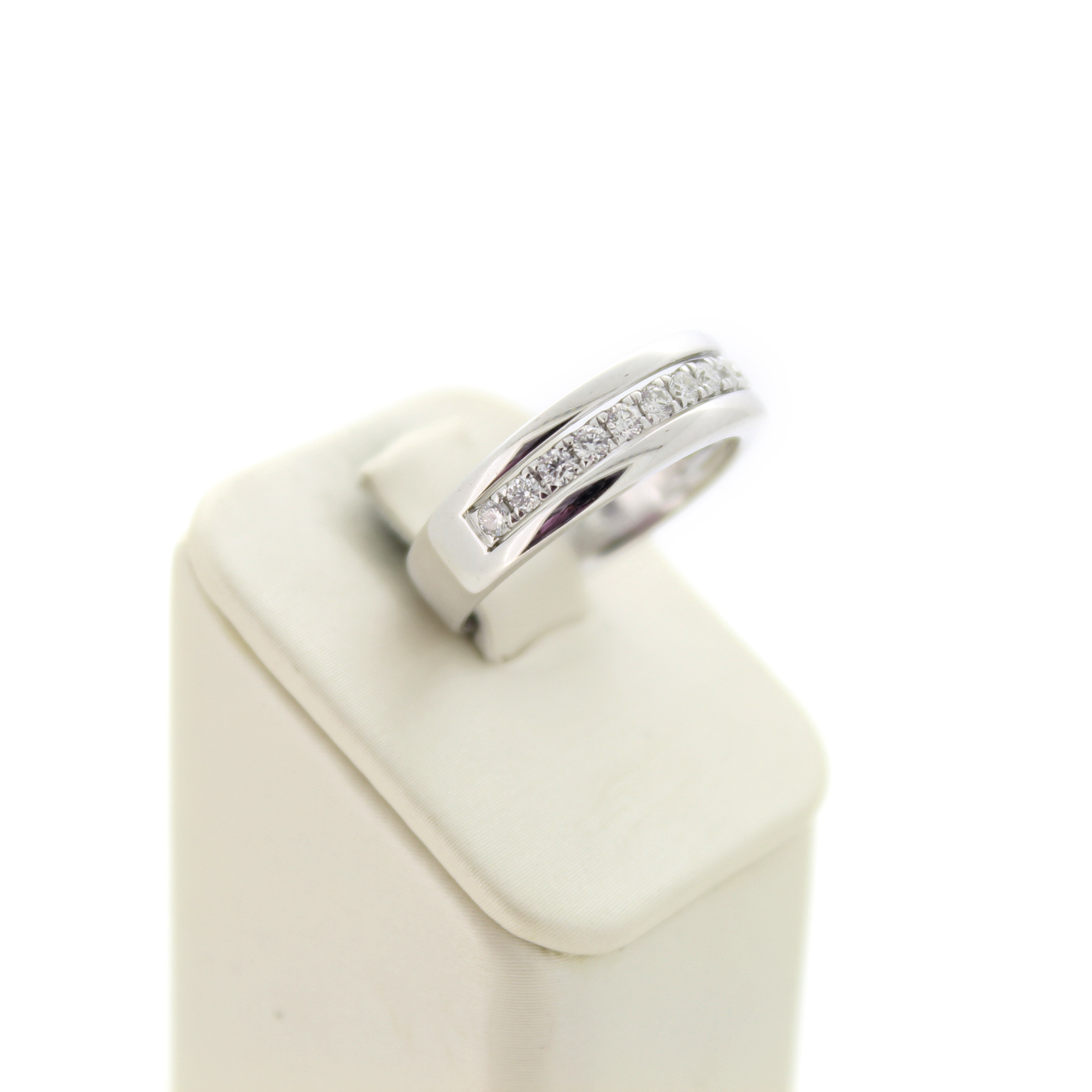 Deze tweedehands ring is vervaardigd uit witgoud 18 karaat. De 18 karaat witgouden ring is gezet met briljanten.