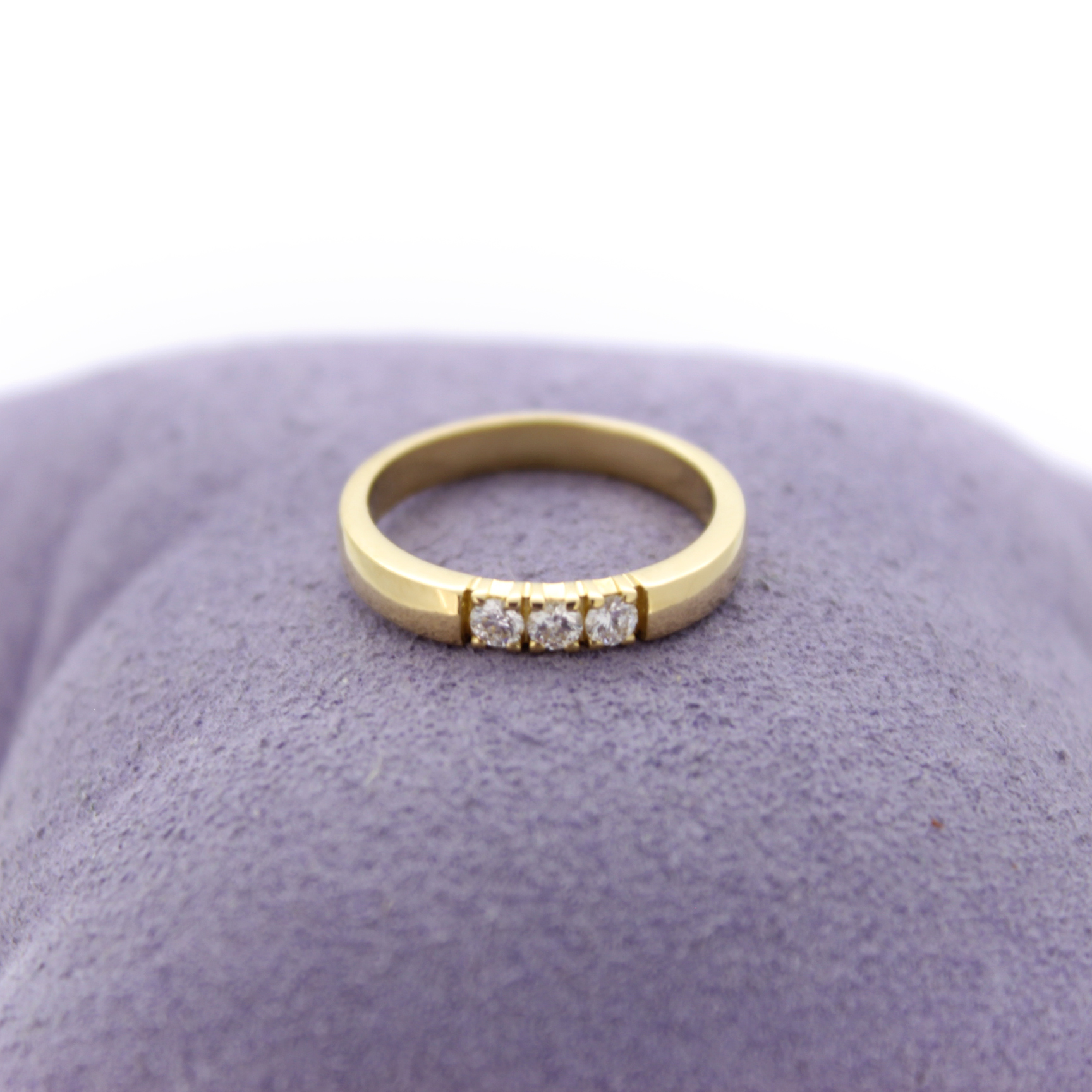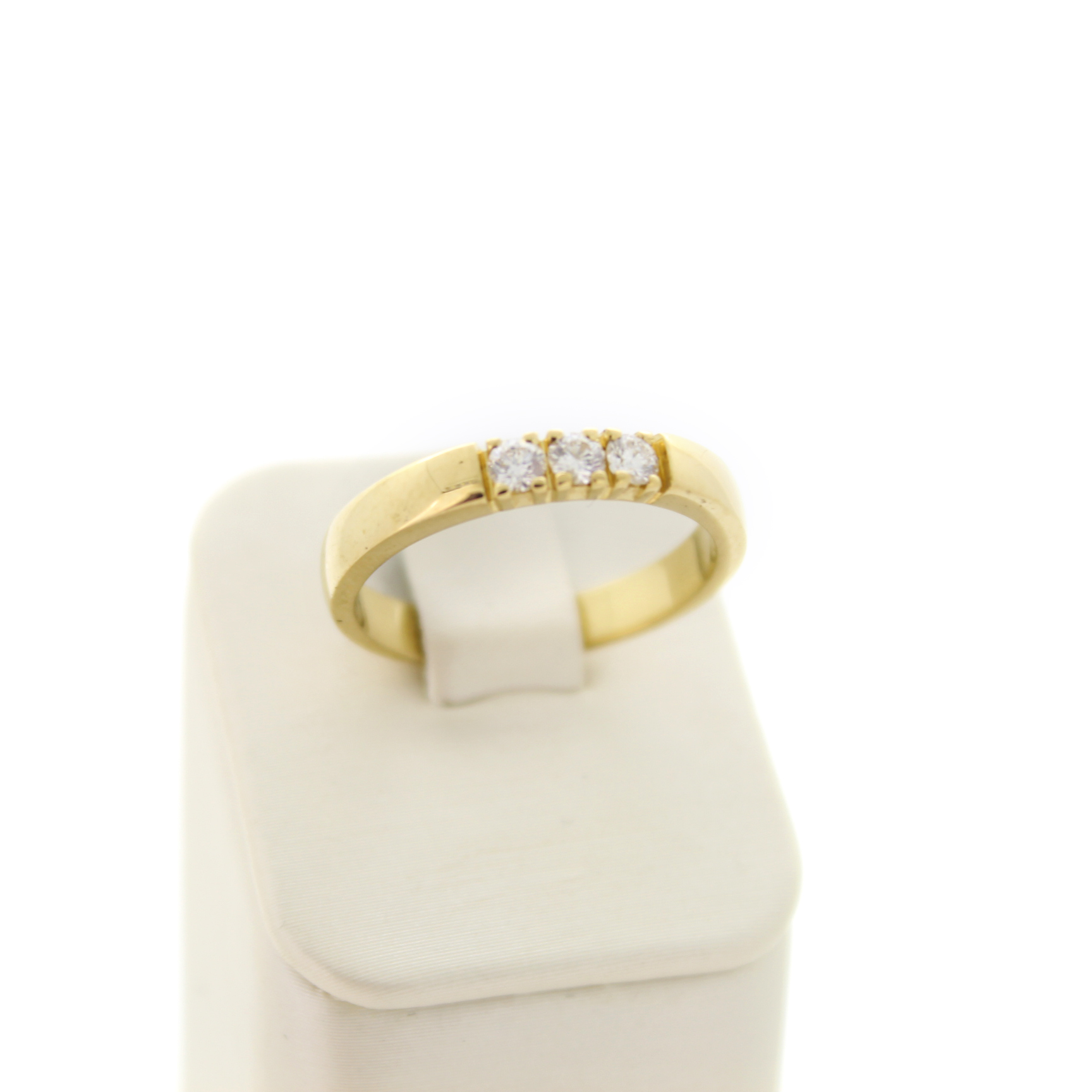 Het betreft een elegante ring in 18 karaat geelgoud, bezet met drie briljanten van schitterende kwaliteit.