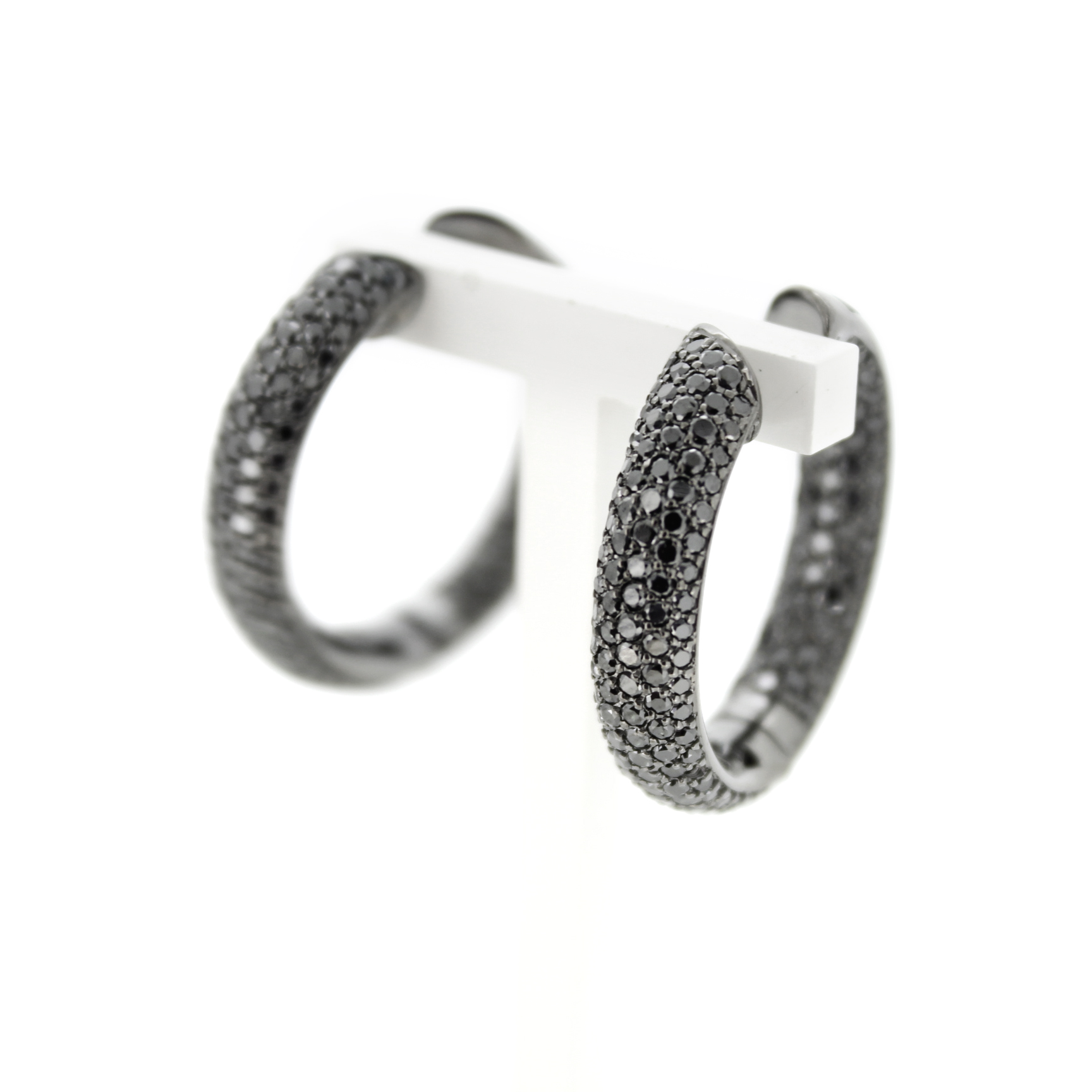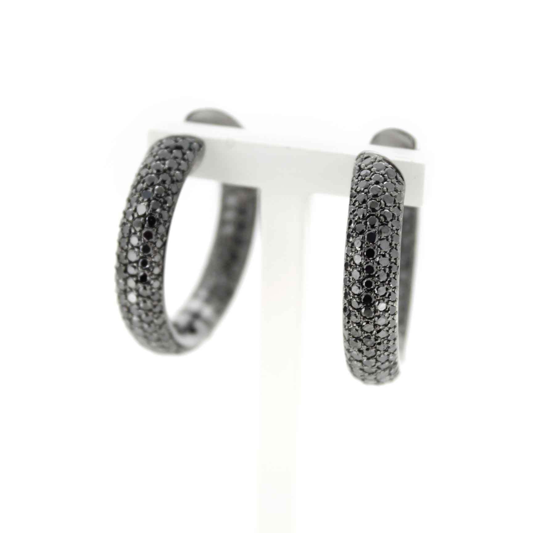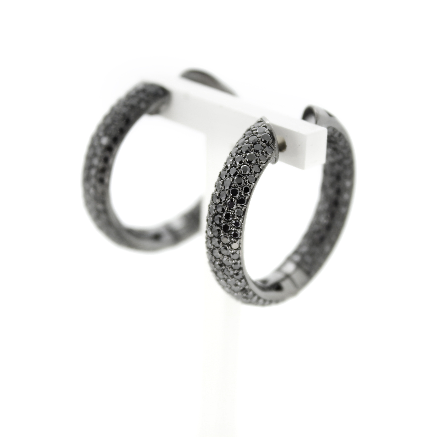 Deze elegante pré-owned creolen zijn vervaardigd uit 18 karaat witgoud, zwart gerodiëerd, en subtiel bezet met zwarte briljanten, wat zorgt voor een tijdloze en stijlvolle uitstraling. De oorbellen hebben een gewicht van 6,7 gram en verkeren in uitstekende conditie.