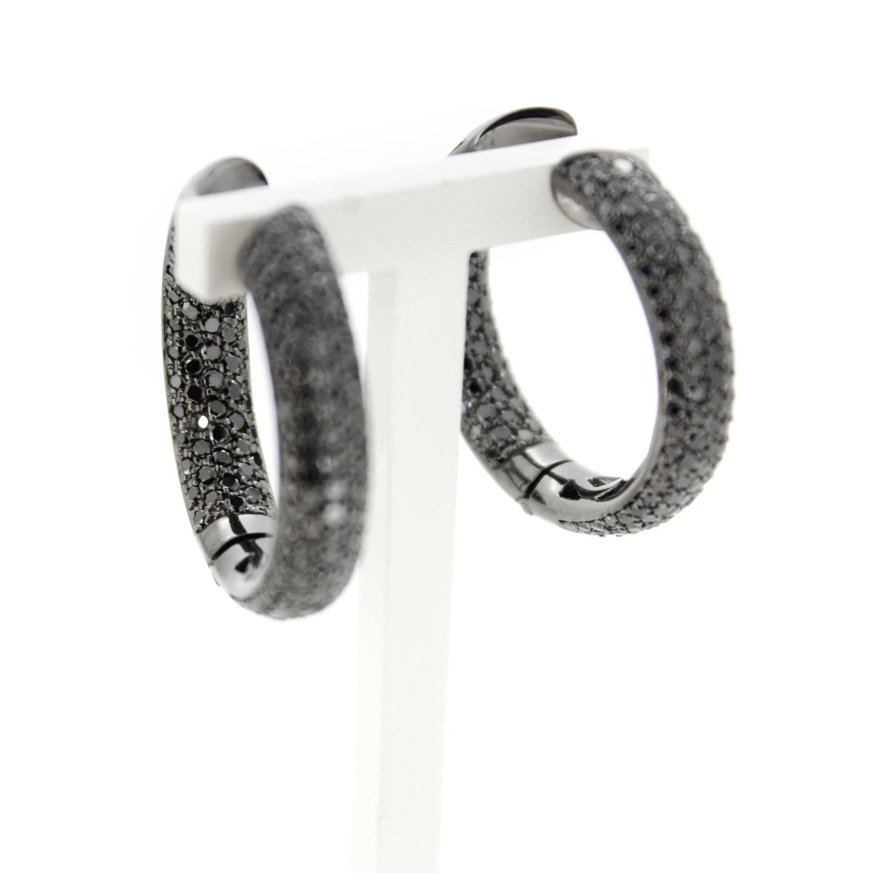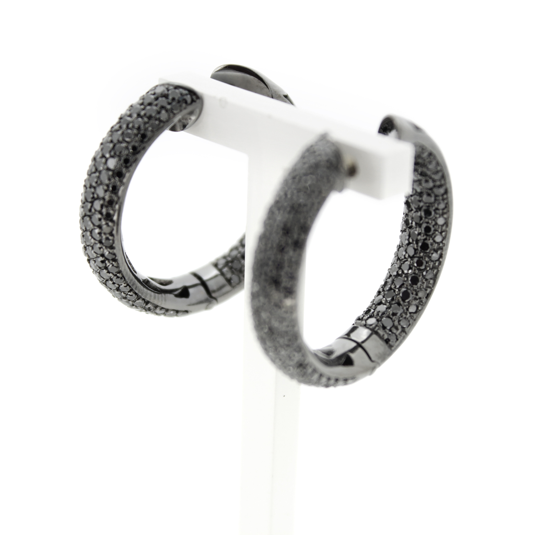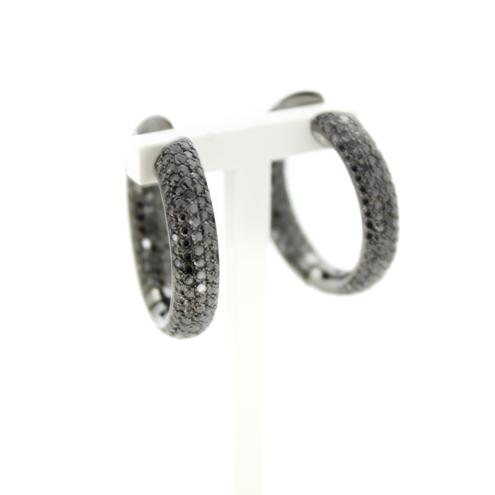 Deze elegante pré-owned creolen zijn vervaardigd uit 18 karaat witgoud, zwart gerodiëerd, en subtiel bezet met zwarte briljanten, wat zorgt voor een tijdloze en stijlvolle uitstraling. De oorbellen hebben een gewicht van 6,7 gram en verkeren in uitstekende conditie.