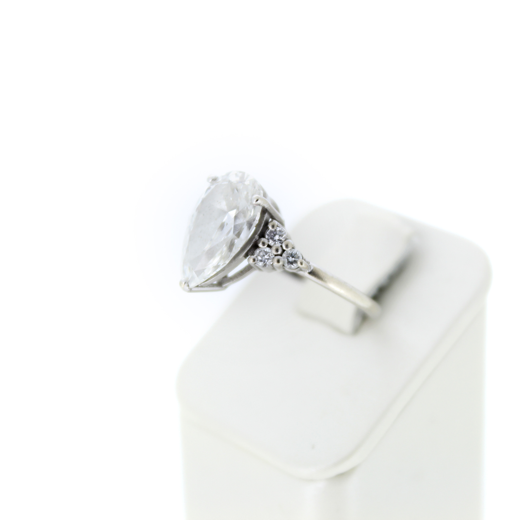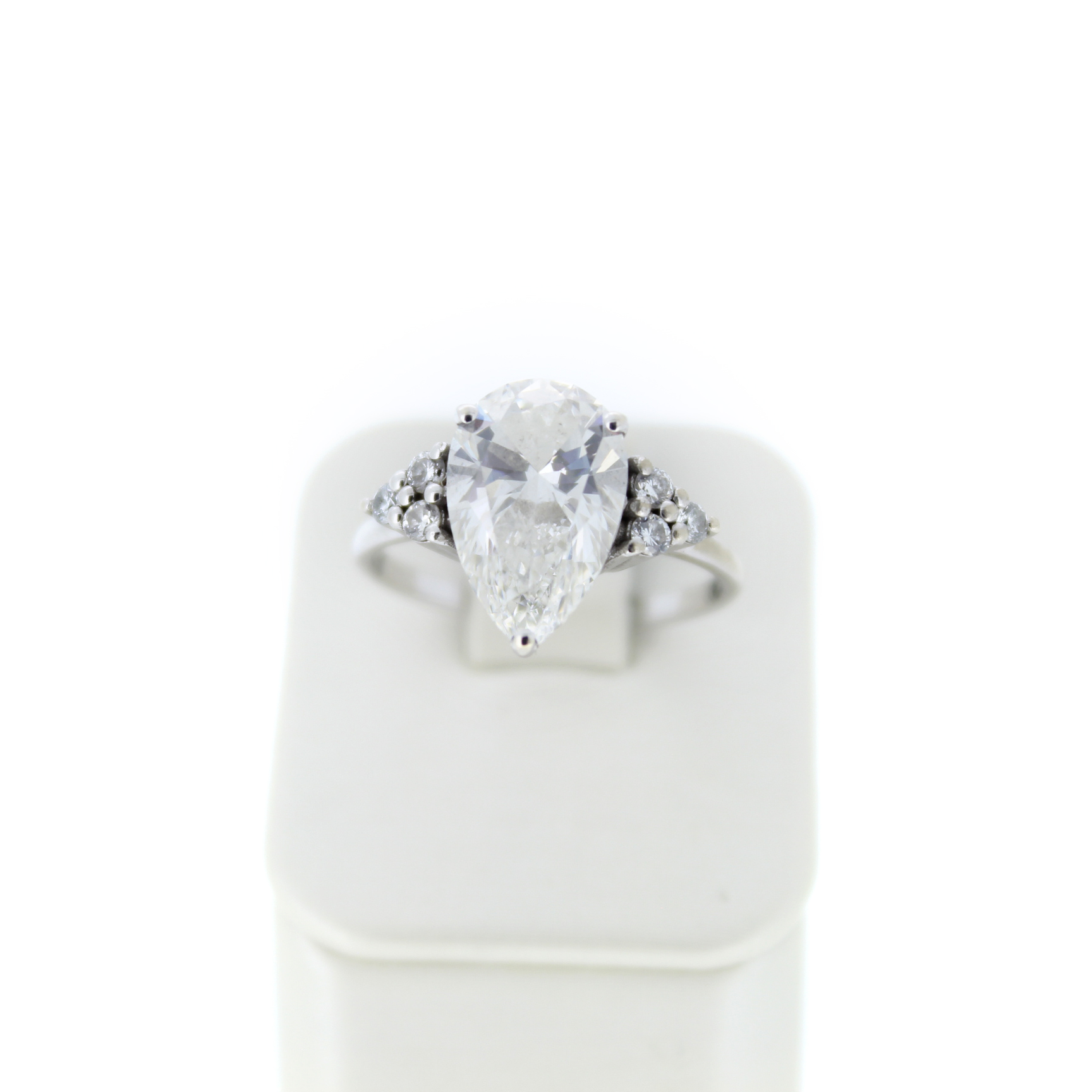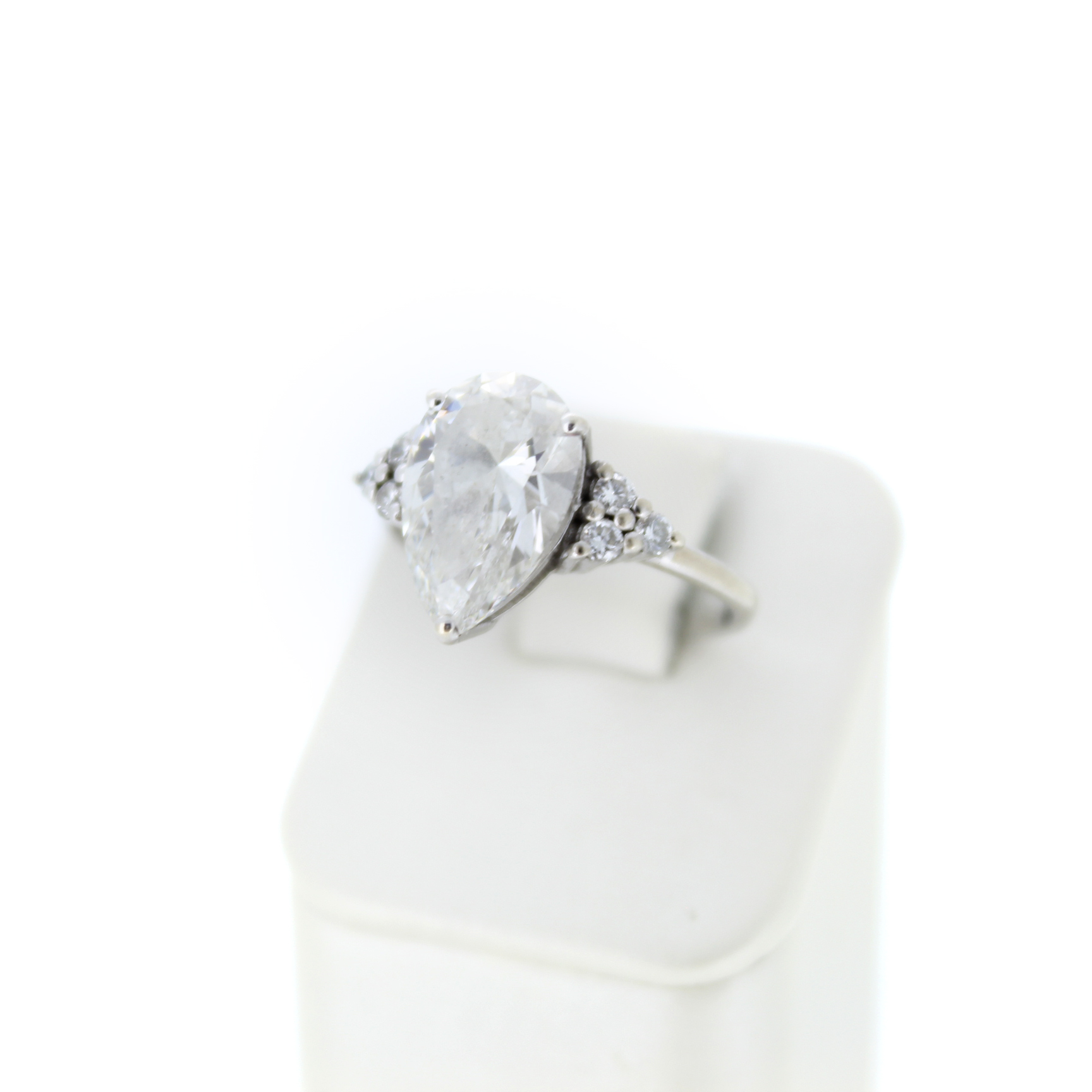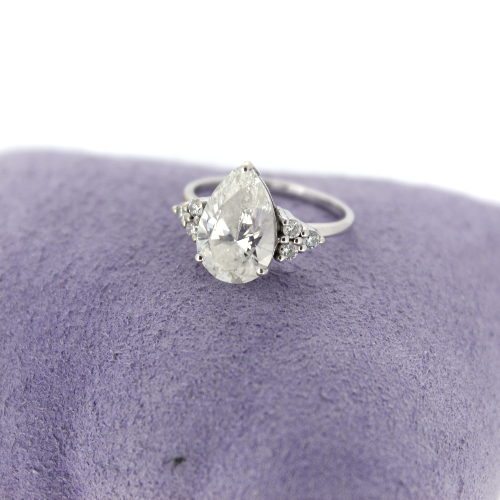 Deze verfijnde tweedehands ring is vervaardigd uit 14 karaat witgoud en is bezet met lab grown diamonds van uitzonderlijke kwaliteit. De centrale steen heeft een gewicht van 3,02 karaat met een kleur F en zuiverheid VS1, aangevuld met 6 bijkomende lab grown diamanten van samen 0,20 karaat. Deze combinatie zorgt voor een luxueuze uitstraling en een schitterend lichtspel.
